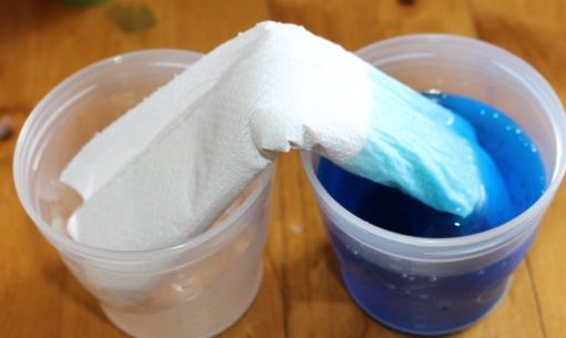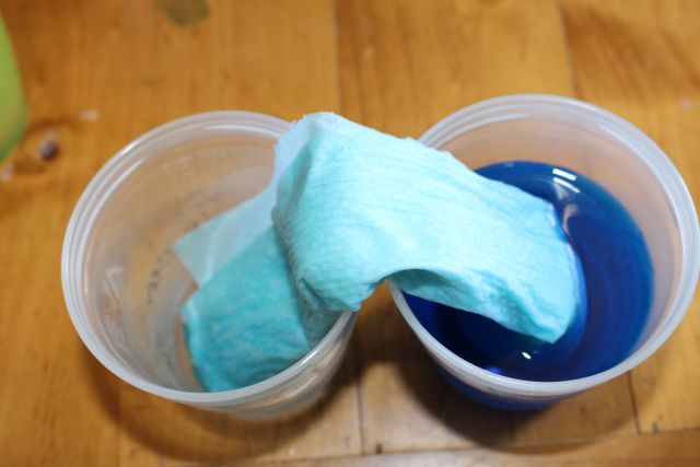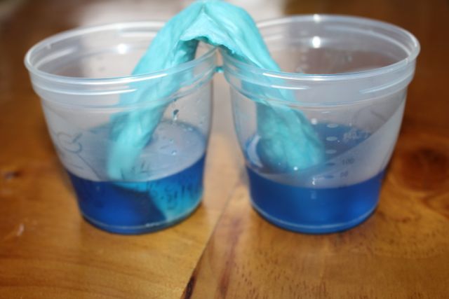 I rolled up about three sheets of paper towel into a cylinder, and placed one end into the water, then I bent the paper towel over so that the other end rested in the other cup. We could already see the blue water rising up the paper towel.