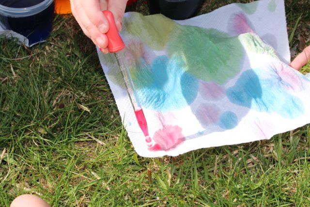 We ran out of paper to paint on this week, so we tried painting some paper towel with water coloured with food colouring. We used eye droppers (bought at the chemist) to drop the coloured water onto the paper towel. It was fun to watch the colour spread out as it was soaked up by the paper towel.