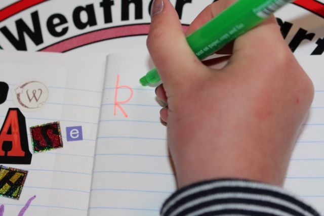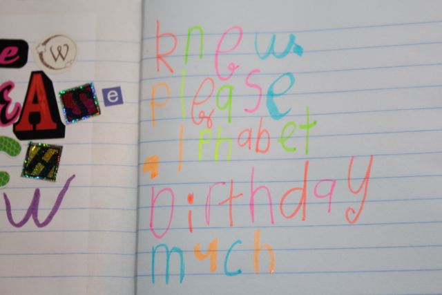 2) Highlighter words. Never underestimate how much kids like to write with highlighters. L used a pack of six different coloured highlighters to make her words bright and colourful.