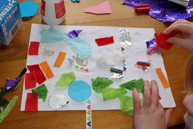 What kid doesn’t love using glue? I gave A a pot of Clag glue, a piece of paper and some collage materials. I’ve got to watch her like a hawk with the glue, otherwise it ends up all over the place, and often in her hair, which is yuck. She just likes to put glue anywhere and everywhere. When she does get the glue on the paper she can make some fun and colourful collages. I’ve been trying to get her to put the glue on the paper first and then stick different items onto the glue sections. She likes to put the glue onto the item instead, which means getting glue on her fingers, and then everything sticks to her. She alternatively likes this and hates it.