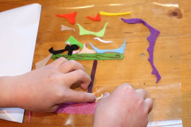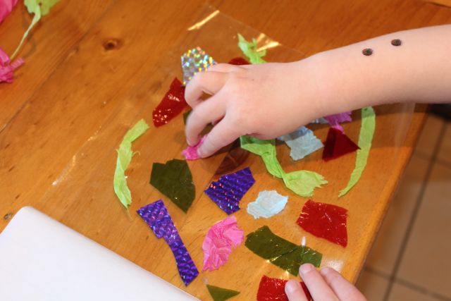 We put some clear contact to a use other than covering books today. I cut some rectangles of clear contact and folded them in half, then peeled off the backing from one half, and placed it sticky side up on the table. L and A put little bits of tissue paper, felt scraps and cellophane onto the sticky contact. Once they had completed their collage picture, I carefully peeled the backing off the rest of the contact piece, folding it back onto the other half, enveloping the collage materials between the two halves of the contact. The collage items are held still between the layers of clear contact, and looks a bit like the picture has been laminated.