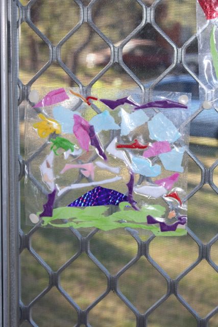 A used some blu-tack to stick the finished art to her window.