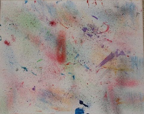 L used the screen and toothbrush on her canvas to create a sprinkle painting. She used one colour at a time because the screen was very small. She put some paint onto the brush and rubbed it across the screen, whilst holding the screen fairly close to the canvas, but not touching it. This produced a fine mist of paint directed onto the canvas. She washed and dried the screen and brush between colours, and continued using paint until her canvas was covered by rainbow mist.