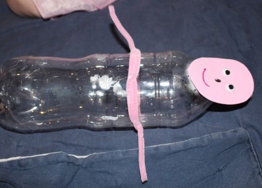 IMG_8631I twisted two pink pipe cleaners today to make one long one, and I helped A to wrap this around the bottle to make some arms.