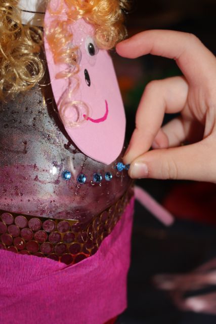 Once she was dressed, it was time to “make her pretty” according to A. She didn’t like the bald look her doll was sporting, so she added some curly doll’s hair to the top of the bottle and around her face.