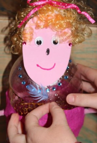 We had an empty mineral water bottle that we washed out, and removed the label from. I cut out an oval of pink foam for the doll’s face, and A glued it to the top of the bottle. A decorated her doll’s face, giving her googly eyes, and using a marker to make a mouth and a nose.