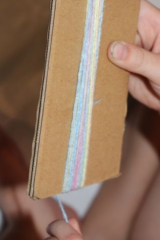 First I cut some sturdy cardboard up into two rectangles to use to wrap the yarn around to make the body of the doll. I started each child off by winding the yarn around a few times, and then they continued to wind it until it was as thick as they wanted it to be. Once that was done, I helped them remove the hank of yarn from the cardboard. From this yarn we would make the head, body and legs of the doll.