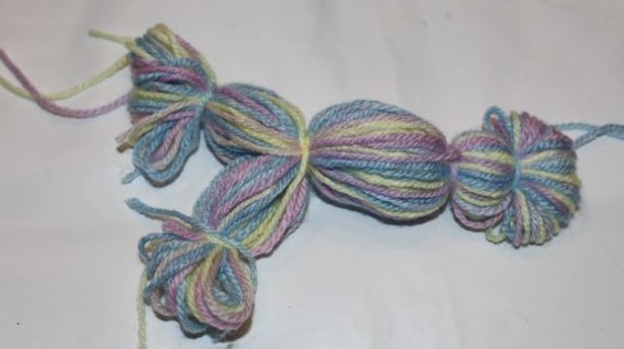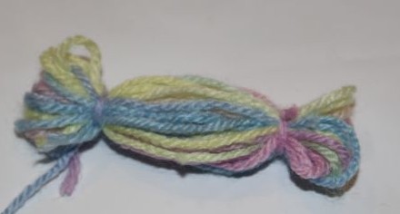 To make the arms, the kids wrapped some more yarn around their cardboard, but this time, around the shorter sides of the rectangle. This hank of yarn was also not as thick as that of the body. Once we had removed this yarn from the cardboard, a small section on each end was tied off to form the hands.