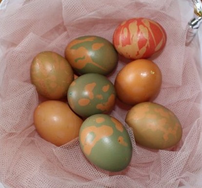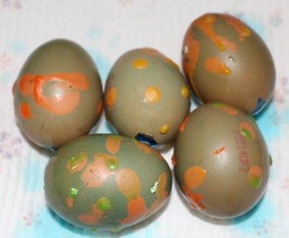 When I removed the shells from the coloured water, we shook out as much water as we could, blew out the rest, and placed them on paper towel to help absorb any excess water. Most of the wax scraped off easily with my fingernails, and the loose wax wiped off with a tea towel. The wax protected the shell from the food colouring, creating patterns of colour and natural egg shell. Blue and red were the strongest colours, and green was light, but still good. The yellow was hardly visible at all, though looking closely, it was possible to see the pattern. The colours may have been more vivid if I had had lighter coloured eggs to work with.