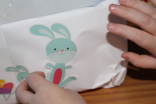 The kids decorated a plastic ice cream container that I had covered in white paper. They added Easter stickers and some curly ribbon to make it pretty on the outside. Inside, we placed some bunched up pink tulle to make a cushion for the egg shells to lay in. This has been placed on the table as a centre-piece.