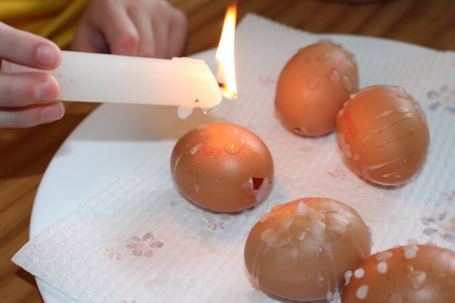 The eggshells needed to be dry before we added wax to them, so we dried them in a tea towel, being careful not to break them. I lit a candle with a match and let some of the wax melt. Then we dropped the wax onto each shell, making spots and lines. Melted wax is hot and can burn, so it was particularly important to do this part carefully and with adult supervision. L had a go at placing wax on the shells, but A did not, as I felt she was a bit young to do this without incidence.