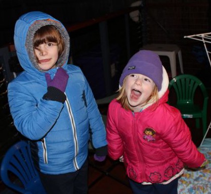 A pulled out an old cot mattress and blankets and set them up as a bed. At this point I insisted that she put more clothing on. L also got involved then, as they decided to play Eskimos. I helped to dress them both, with tights, track pants, two pairs of socks and slippers, singlet, long sleeve shirt, jumper and parka, as well as a beanie and mittens. A couldn’t find her mittens (she has three pairs, yet none could be found….), so she put an extra pair of socks on her hands. They were complaining that they were too hot while they were still inside, but I explained that they would need it outside.