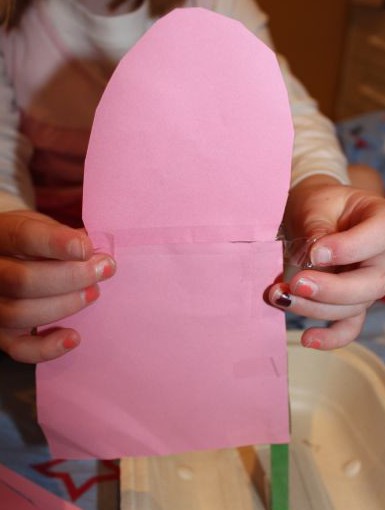 A joined two pop-sticks together end to end to form a mast. I made a small hole in the base of the cardboard boat to insert the mast. A then used tape to secure the mast to the base. She cut out some pink paper for her sail and taped it to the mast. I had been thinking we would just cut one of the paper squares in half diagonally to make a triangular sail, but A had other ideas, and made her own unique sail from two pieces of pink paper.