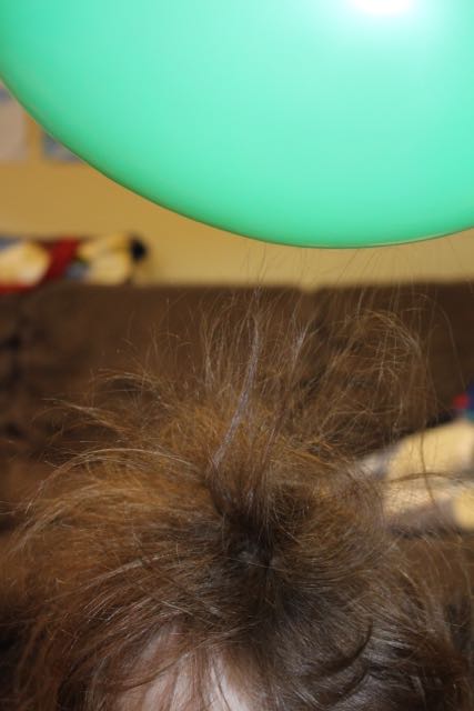 We used balloons to demonstrate and play with static electricity. I blew up a couple of balloons and gave one to each of the kids. First they rubbed their balloons against their hair to build up the charge. When they raised the balloon away from their heads their hair was attracted back to the balloon, looking like it was standing on end. They also tried rubbing the balloons on the carpet, and on their clothes, but it didn’t provide enough charge to lift their hair.