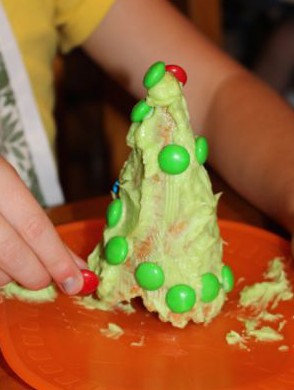 L helped me to make up a portion of light green buttercream, which we used to cover the cones with. Then we added red and green m&ms, pastel coloured sprinkles and mini m&ms. The kids added jelly babies to the top point of their trees at the star/angel.