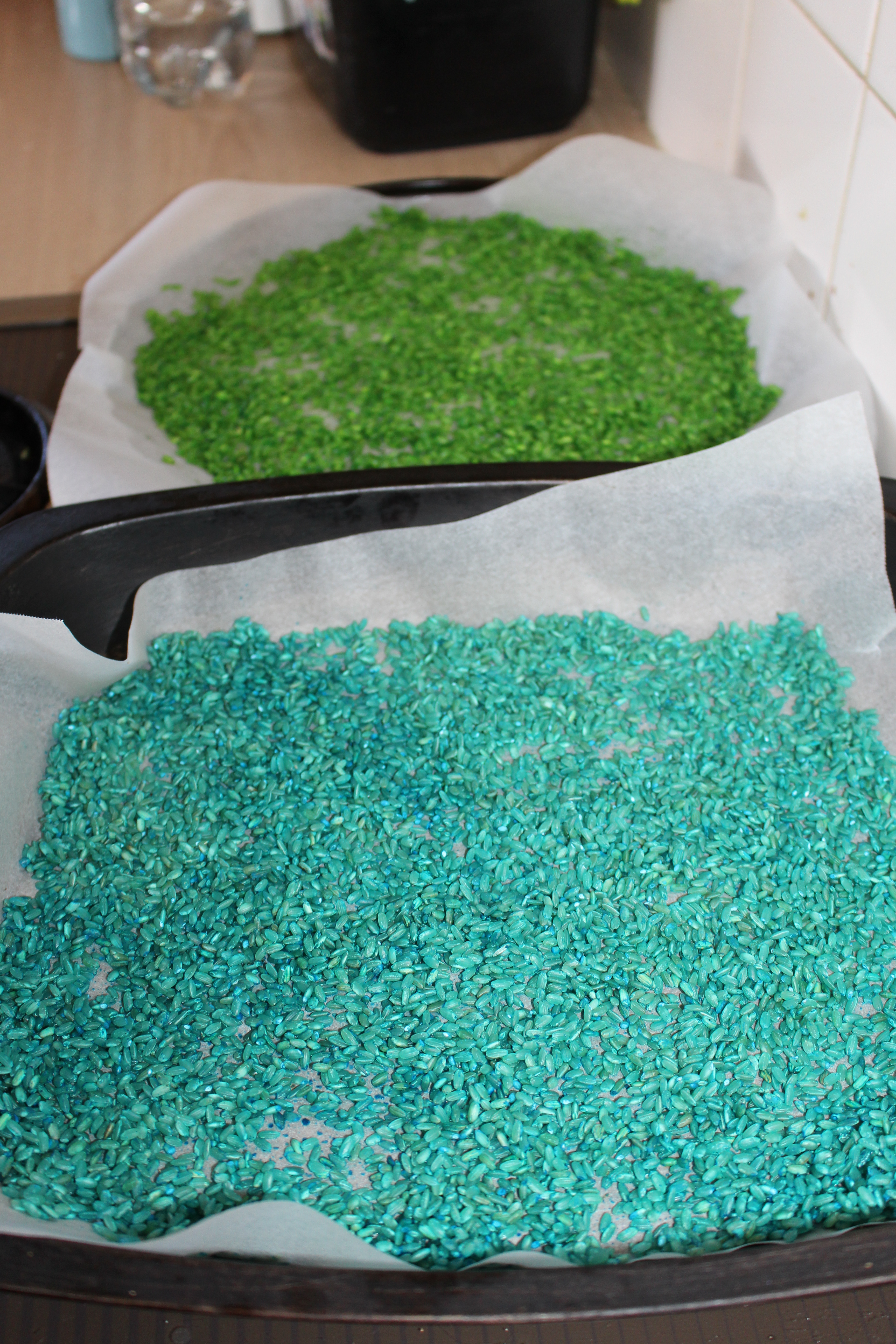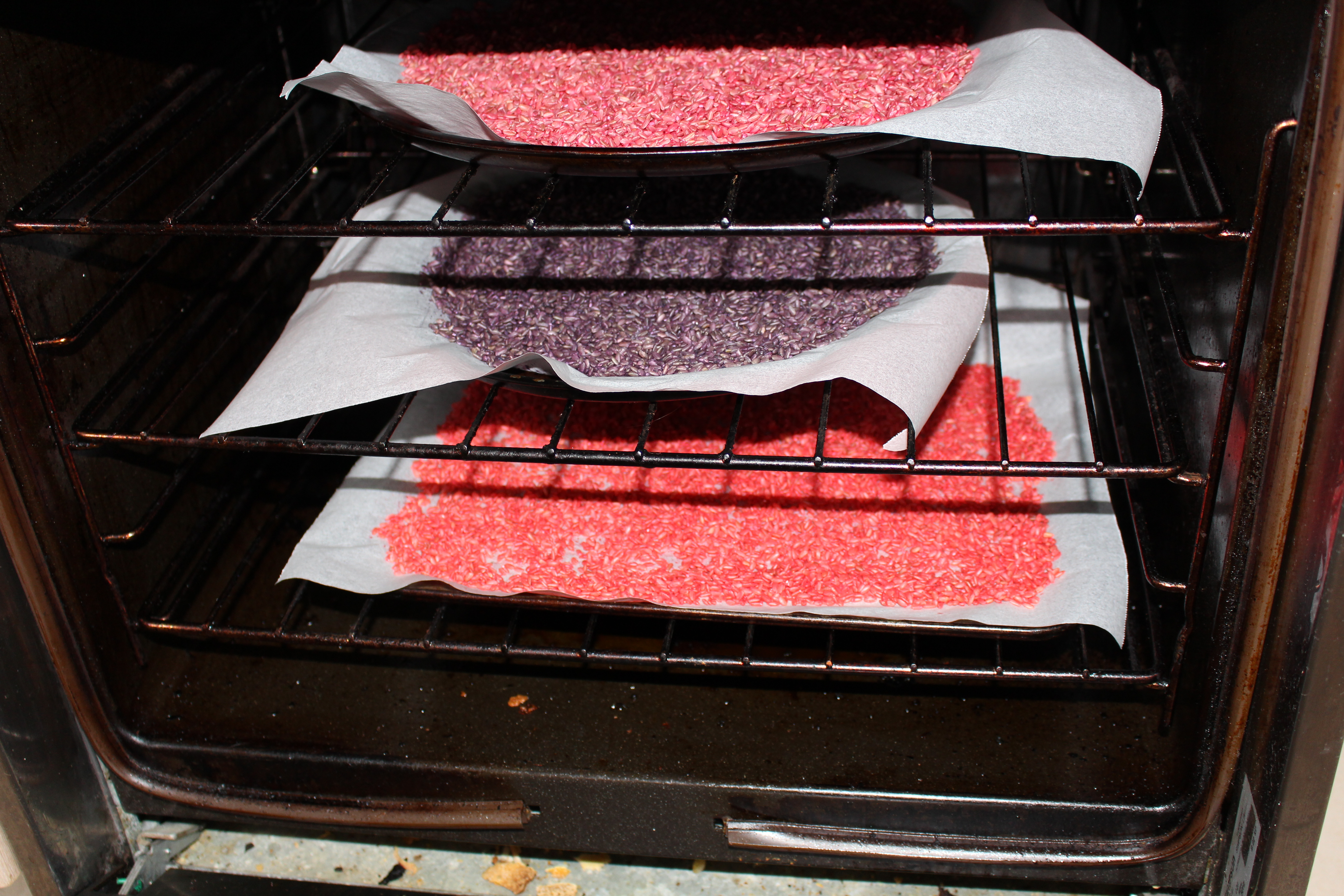 The rice needed some time to dry so I spread it out on baking trays. I popped it in the oven on low