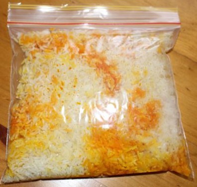 The kids started out with one colour each, but predictably, that didn’t last long, and we soon had rainbow rice. They also wanted a little bit more, so we added some plain white rice to the mix as well.