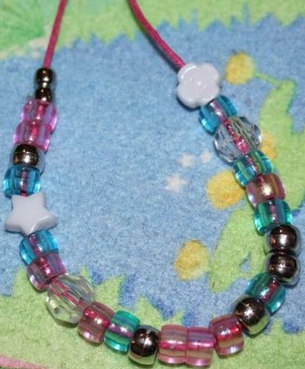 We usually use elastic for our beading projects, as it makes it easy for the kids to put on and take off themselves. Proper clear beading elastic is the best for this, but we have used basic hat elastic too. Unfortunately, after a while, the hat elastic tends to stretch and break, which requires tying the broken section together (more knots on the necklace) or re-threading the beads.