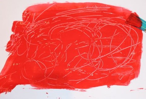We used everyday white glue to paint each word onto a page of paper. T1 chose to do all of his words in red sand. After painting all of the letters in each word, he carefully sprinkled the sand onto the glue. Once there was enough sand to cover all of the glue, T1 tipped the excess sand off into the baking tray we were using underneath the paper (useful for reducing mess)