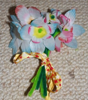 We cut the streamers into strips, and laid them in a pile. Then A twisted the end of the pile together and used sticky tape to secure it. She placed the bundle of streamers into one end of a cardboard roll and taped it down. She fluffed out the streamers in all directions to create the top of the tree. A has been referring to this tree as her “jungle tree”.