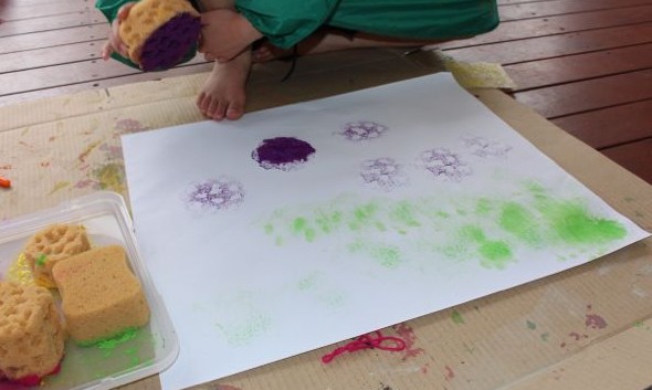 They also tried using the jet setting on the spray bottles, which sprayed the paint quite a long way. They loved the noise it made when the paint hit the paper, but they also missed the paper a number of times. Once they hit Big L in the back while he was across the yard tending the garden, but most of the missed paint sprayed onto the clothesline. After the paintings were dry and I’d removed them from the line, I hosed as much of the paint off as I could. Most of the paint came off that way, the rest just adds character to our clothesline 🙂