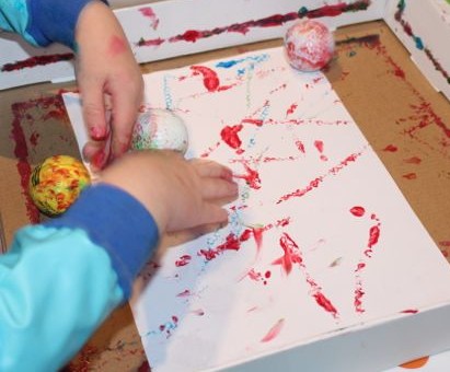 I hung paper from the clothesline for this activity. It took the kids a little while to learn not to spray when the wind was blowing towards them, but eventually they got more paint on the paper than on themselves! They were wearing their art smocks, but they definitely required a bath after this.