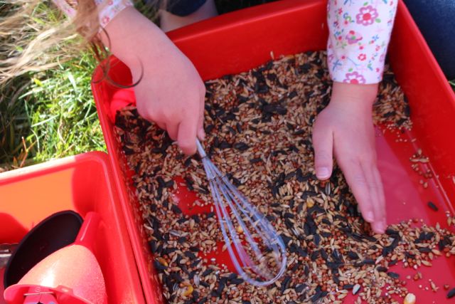 Then A rolled the pinecone in a bowl of birdseed. We used a basic parrot mix because most of the birds that hang about in our yard are parrots such as cockatoos and galahs. A pressed as much seed into the sticky peanut butter as she could, completely covering the pinecone. When the pinecone could hold no more seed, we took it into the yard and hung it up in a large bottlebrush tree.