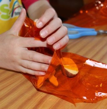 The kids cut some cellophane into squares and placed about four chocolates onto each square, then brought the cellophane up around the chocolates creating a little bundle. We added some curling ribbon to tie it up, and I curled it with scissors. L tried to curl her own ribbon, but she didn’t quite manage it. They want to give their little parcels of Easter chocolates to relatives.
