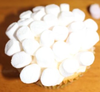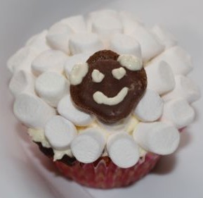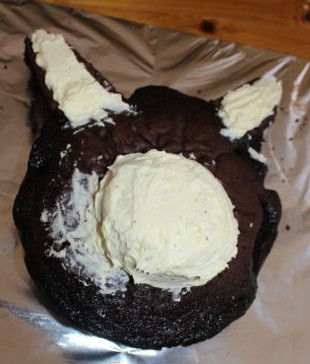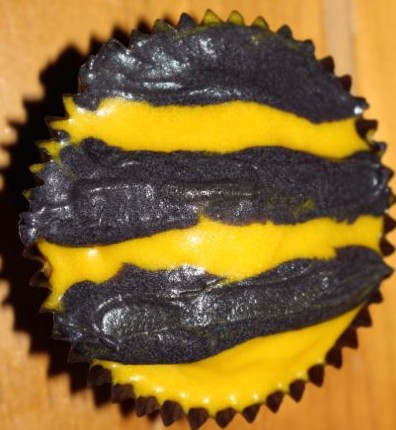 Once the cupcakes were completely cool, A and I divided the cupcakes into piles for each level on the stand. The lowest level held the most cupcakes, and was to represent the water of our island. A helped me mix up the butter (vienna) cream to ice them. I like to use a simple recipe for butter cream that I found on Taste.com. We added some blue food colouring to the butter cream until it was the blue we wanted, and then we generously covered the cupcakes with it. We used the flat edge of a knife to create the “waves” by tapping the top of each iced cupcake, pulling some of the butter cream up in peaks.