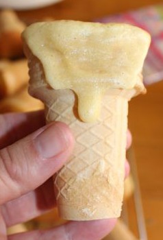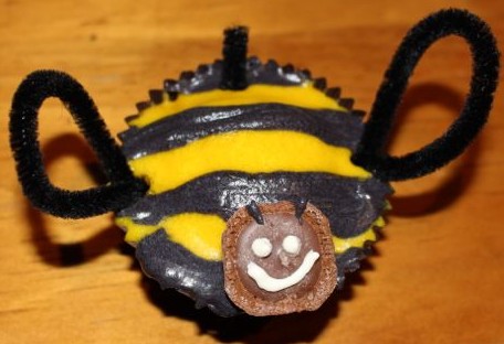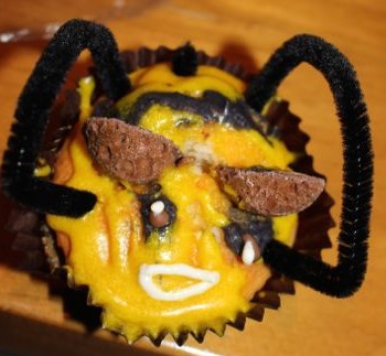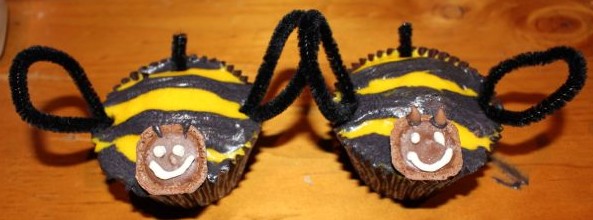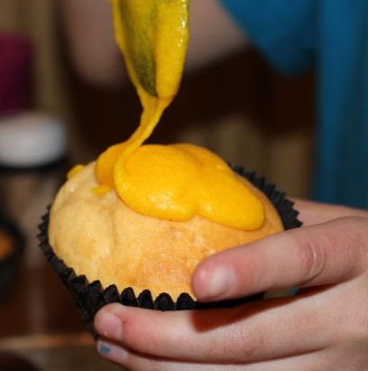 First, we baked the cupcakes using a basic butter cake mix. A helped me set out the paper cases (she chose ones with Disney Fairies on them!), and spoon the mixture into the cases. We only filled each one about half way so that they didn’t rise too much.