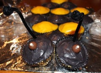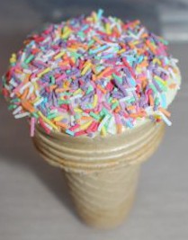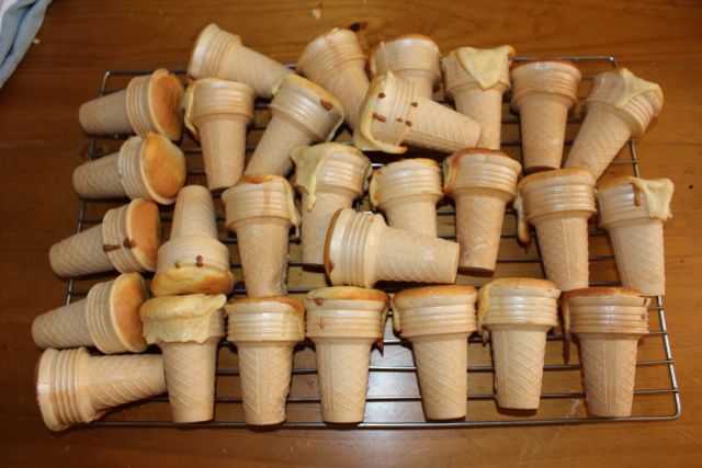 We made a second batch of butter cream, this time colouring it yellow for our layer of sand cupcakes. We had previously coloured coconut to use as the sand on these cupcakes. We covered each cupcake with butter cream, and then dipped them into the yellow coconut until the tops were completely covered. I made the butter cream thick on these cupcakes to help hold the plastic toy palm trees we then placed on each one.