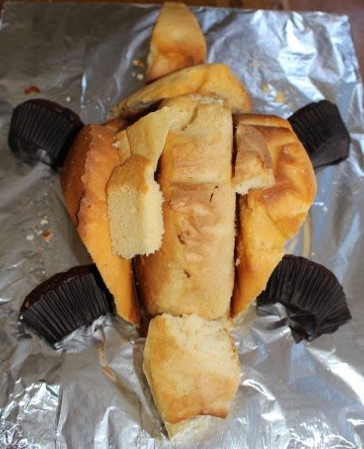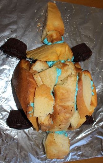 Initially, Big L made two round butter cakes for me to use. I created the body, head and tail from these cakes, and then I used two halved double choc muffins for the legs. I cut one of the cakes just past the half-way point, to create the centre piece of the body, which I flanked with semi circular pieces of cake from the other cake. I shaped these pieces of cake to create a curved body. I used the left over cake to build the body into a nice dome shape, with a tail at one end and a head at the other. I know it looks a little choppy using the little pieces to get the shape I wanted, but once it is covered in butter cream, it looks very different. The cake is built up on our cake board, which is just a sheet of plywood covered in aluminium foil.