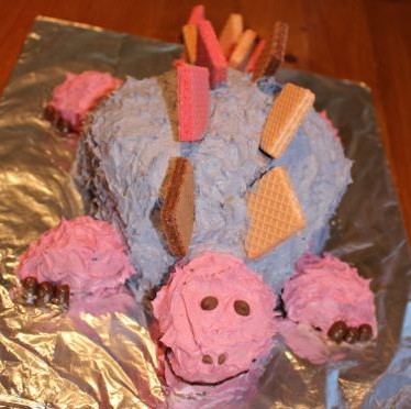 L chose to make the stegosaurus purple and pink. The initial batch of blue butter cream was used to stick the loose pieces of cake together before starting the main icing of the body, and wasn’t seen on the outside of the finished cake.