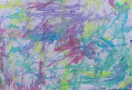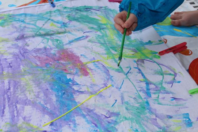 L preferred to paint a picture on her pillow case. She drew mountains and hills, the sun, grass and herself standing next to her trampoline. She was much better able to control the flow of paint than A, and she even mixed some of the colours to create new colours.