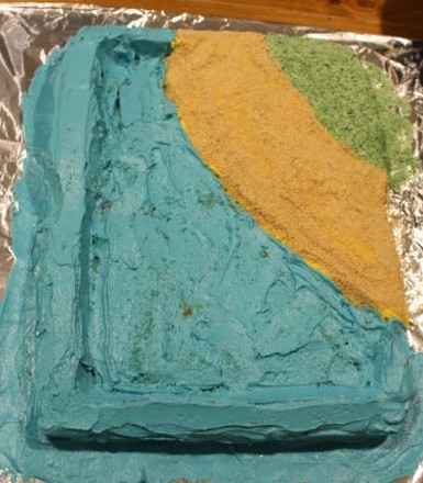 The actual cake was two large rectangular cakes made in my baking pans (each takes a double cake mix). I placed the cakes side by side then used a sharp knife to cut out the ocean section. I left part of the cake for an island, and the edges prevent the jelly from falling off the cake. I skimmed some of the cake off from the island to create a sloping beach area.