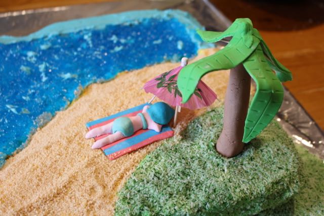 The hardest part of making this cake was the figure on the beach. I made the girl, her towel and the tree from fondant the day before I needed them. The rest of the cake was decorated on the morning I needed it.