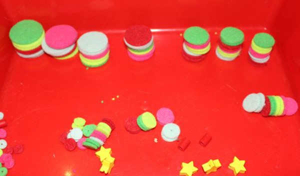 This is a very simple lacing activity using fabric flowers and cut up plastic drinking straws. I bought the flowers from Educational Experience, an online educational supply store. These flowers have little holes in the centre of each one, perfect for threading. You could also make your own fabric flowers from fabric scraps, or use paper/tissue paper for the flowers.