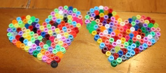 Yesterday we used our melty beads to make some bag tags. A chose to make her bag tag in a heart shape, while L picked to use the star peg board. There are many different shaped peg boards available, and we only have a small selection. There are also lots of different coloured beads, which can be purchased as individual colours, or in various mixed packs. I have always bought sets of mixed beads for variety, and L and A mostly like to place the coloured beads randomly onto their chosen shape.