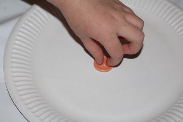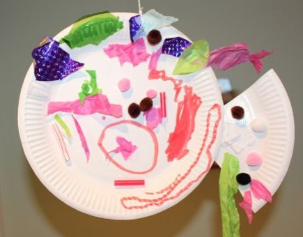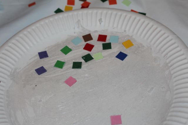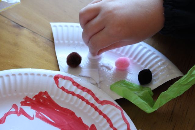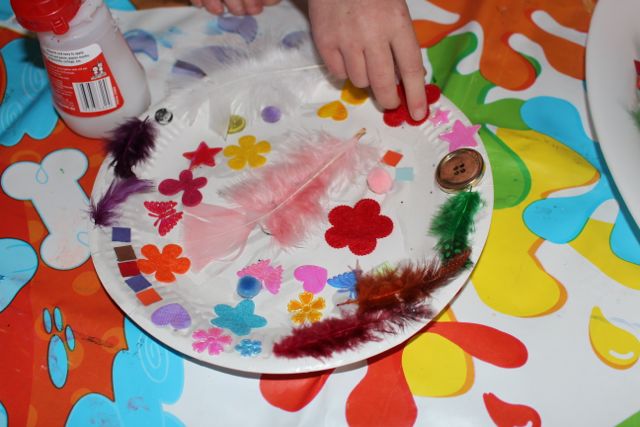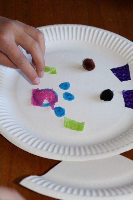 Paper plates, again, so versatile! I cut some paper plates in half and I coloured one half in using markers to form a bright rainbow on one side. I coloured the other side with crayons, which made a pale rainbow. A liked the bright marker rainbow better, so she chose to use the markers for her rainbows. It was easy to make the arch of the rainbow by following the shape of the plate, though for some reason, A’s rainbows have more stripes than normal, and they are a bit jagged and spiky. She is no perfectionist!