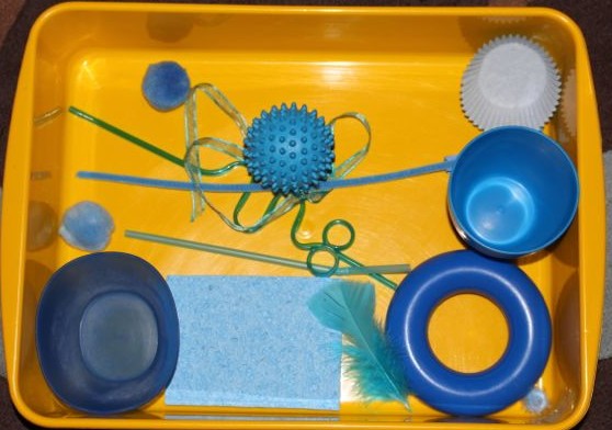 After gathering some green items together, we sat down to our green sensory tub. We had some ribbons, pipe cleaners, bowls, spoons, a toy train and a toy truck, muffin case, wooden and plastic trees and some green toy bugs and snakes. The boys were both very interested in the toy train and toy truck, rolling them all over the tub and the floor. They touched the fuzzy pipe cleaner, and used the spoons to scoop up the bugs. T1 tried to wear one of the bowls as a hat. T2 crinkled the muffin case, and fluttered the ribbon about his head.