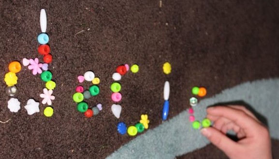 We have actually done a lot of spelling on the trampoline; he says one letter of the word for every jump he does. And we have done lots using other activities, but when I found some tubs of coloured sand, I knew we needed to try making some sand art!