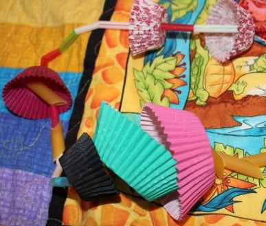 This is a very simple lacing activity using fabric flowers and cut up plastic drinking straws. I bought the flowers from Educational Experience, an online educational supply store. These flowers have little holes in the centre of each one, perfect for threading. You could also make your own fabric flowers from fabric scraps, or use paper/tissue paper for the flowers.