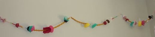 We cut pieces of yarn roughly a metre long, and tied a big knot in one end to prevent the flowers from slipping off. The kids alternated flowers and straws until they had filled their yarn up. I helped them tie the ends together to form a loop, and the leis were ready to wear.